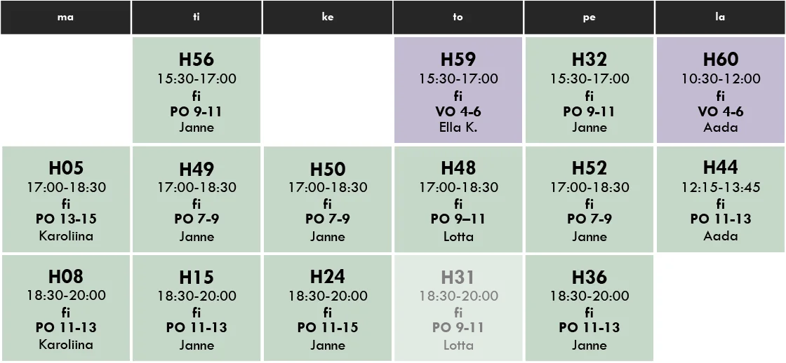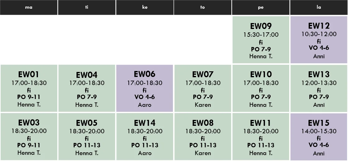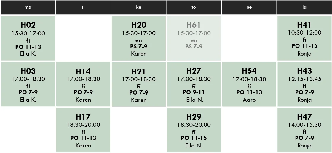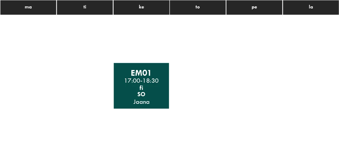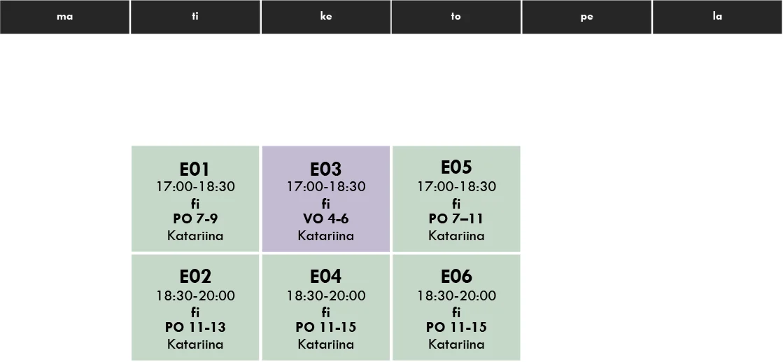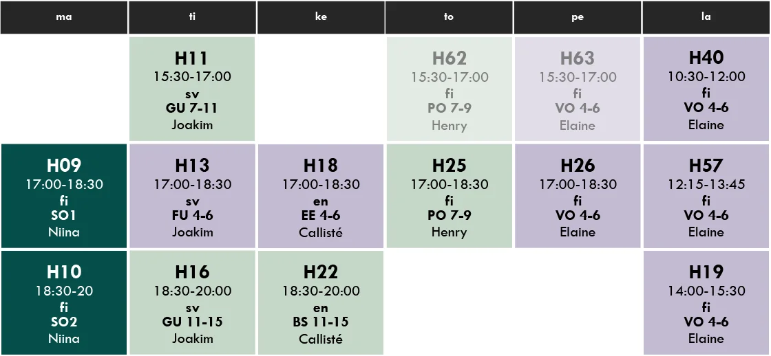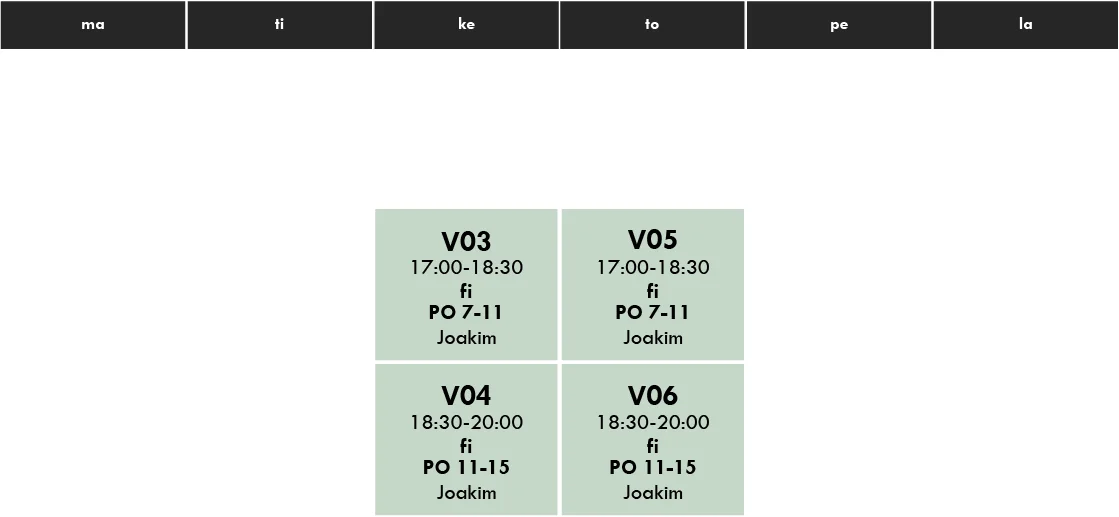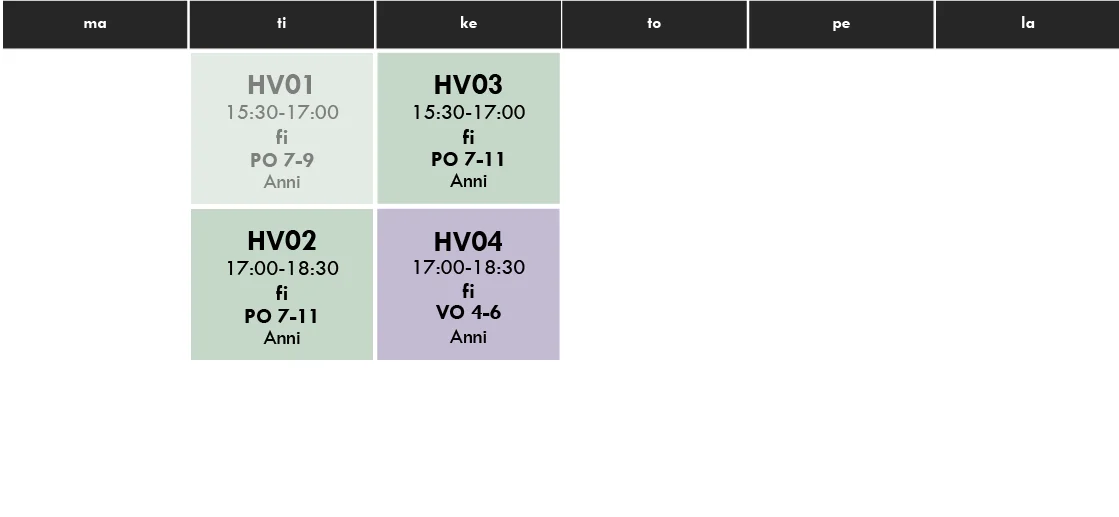 The dropdown menus below display the timetables for each teaching location. You can check the availability of pupil spots for each group in Eepos or by contacting Arkki’s office.
