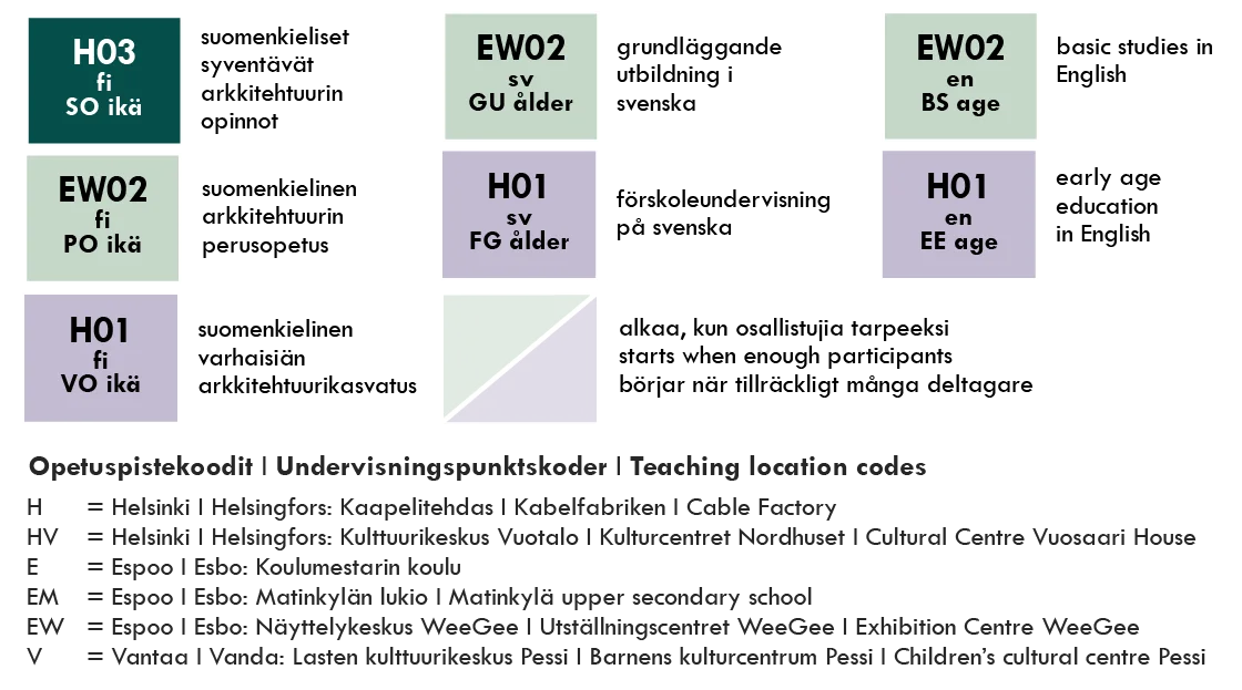 Arkki offers comprehensive basic art education in architecture in Helsinki, Espoo, and Vantaa. The teaching is divided into early childhood architectural education (VO) for 4–6-year-olds in child-parent groups; basic architectural education (PO) for age groups 7–9, 9–11, 11–13, and 13–15; and advanced architectural studies (SO) for those who have completed 800 hours of basic studies. Teaching is provided in Finnish, Swedish, and English.