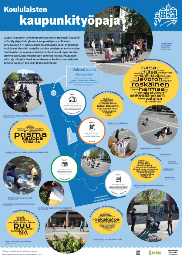 2023 | Helsingfors I verkstäder på våren 2023 utforskade elever från Helsingfors Mediagymnasium Malms stadskärna med Photovoice-metoden. Photovoice innebär att deltagarna tar fotografier, som sedan används för att tillsammans skapa berättelser och kunskap. Genom denna metod kunde Malmi gymnasieelever dela med sig av sina iakttagelser om sin stadsdel och komma med idéer till förbättringar. Eleverna…